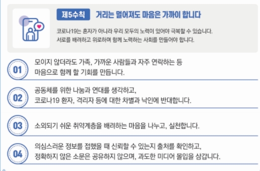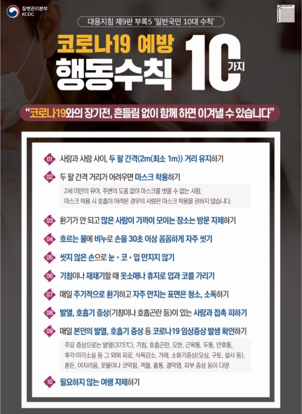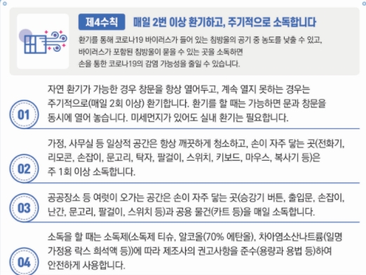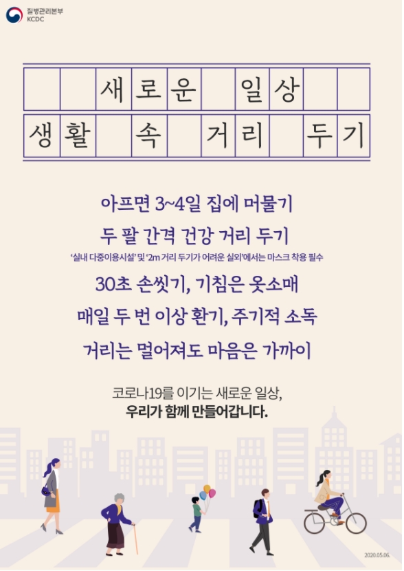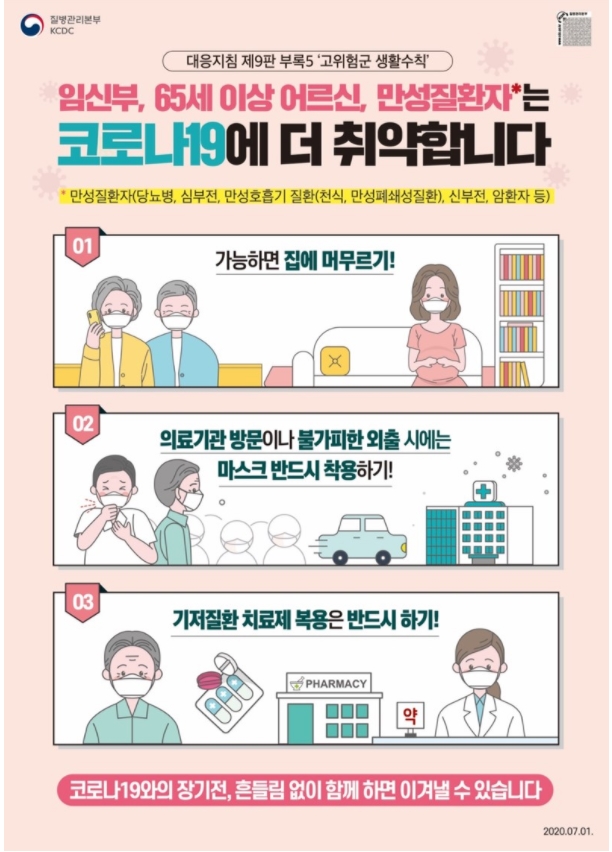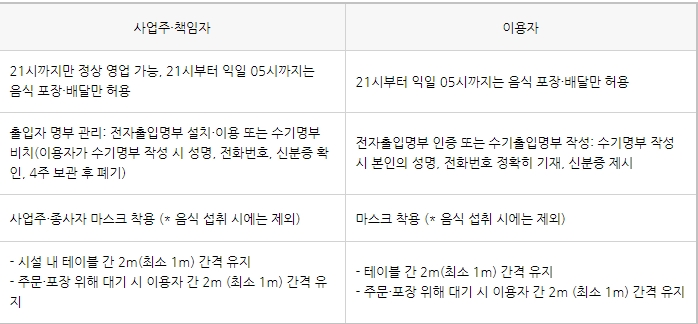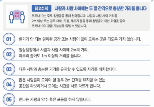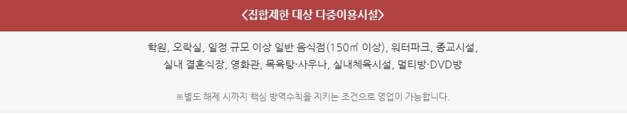 또한 해당시설에서는 반드시 마스크 착용과 출입자 명부관리, 테이블 간 최소 1m, 가능하면 2m 유지 해야 합니다. 고령충 외출자제권고 및 요양시설, 병원 면회는 금지입니다.
