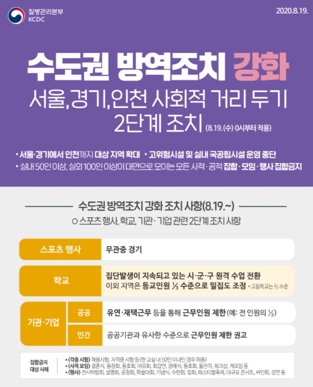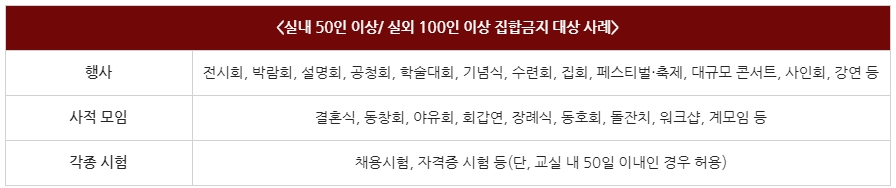 우선 사회적 거리두기 2단계 에서는 실내에 50인 이상, 실외 100인 이상 집합이 금지됩니다. 따라서 대규모 행사 즉 설명회, 박람회, 기념식, 축제, 강연은 물론 두말할 필요도 없이 금지해야 합니다.