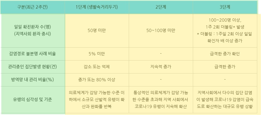 감염경로가 불분명한 깜깜이 감염이 급격하게 증가하고 관리중인 집단발생이 급격하게 증가하게 되면서 하루의 확진자수가 100~200명 이상에 한 주에 두번 일일확진환자 수가 2배로 증가하는 현상인 더블링이 발생하면 사회적 거리두기 3단계 적용되게 됩니다.