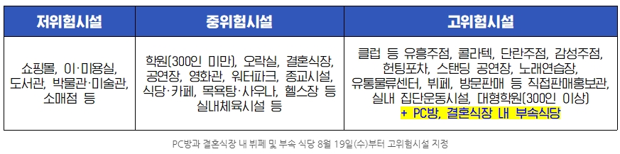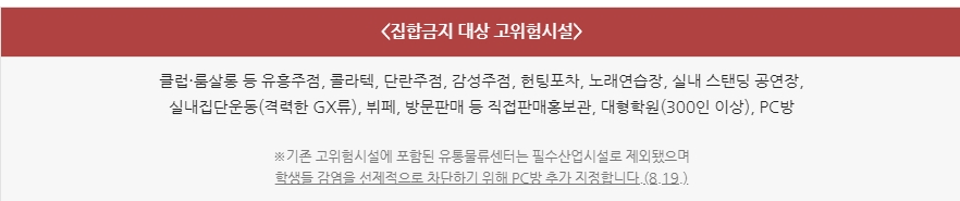 그리고 뉴스에도 많이 나왔던 헌팅포자, 감성주점 이런 곳은 도대체 뭐하는 곳인지 모르겠지만 이름 한번 감성스럽습니다. 하여튼 이런 곳과 주점, 노래연습장, 실내 집단 운동시설 등과 300명 이상의 대형학원, 방문판매와 직접판매 홍보관, 뷔페, PC방 등이 고위험시설로 분류되어 사회적 거리두기 2단계 에서는 운영이 중지됩니다.