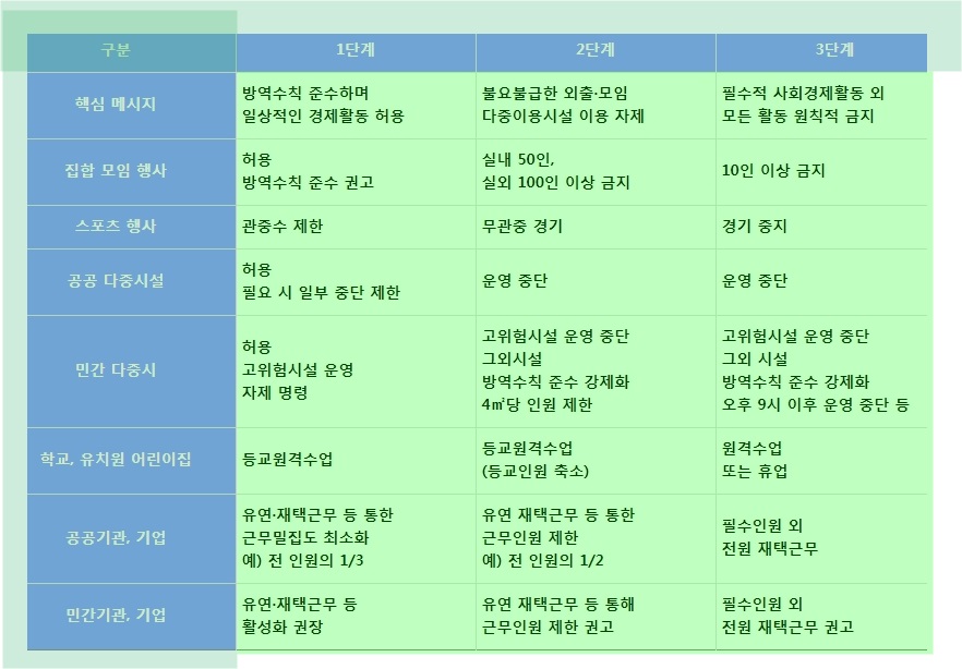 사회적 거리두기 3단계 되면 사회생활은 거의 중단되고 금지된다고 볼 수 있는데 스포츠 행사가 무관중경기에서 경기 중지, 공공다중시설은 운영중지, 민간 다중시설 또한 운영중단, 공공기관은 물론 민간기관과 민간기업도 필수 인원 외 재택근무 상태가 됩니다.