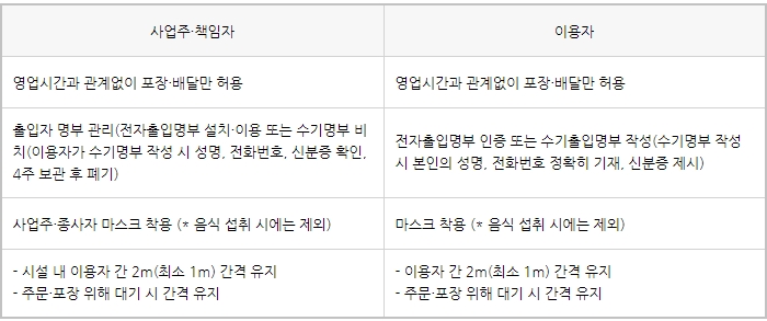 이러한 사회적 거리두기 2.5단계로 수도권의 경우는 프랜차이즈 커피전문점에서는 실내에서는 마실 수 없습니다. 오로지 포장과 배달만 허용됩니다. 일반음식점과 제과점은 오후 9시까지 정상영업, 이후에는 포장과 배달만 허용됩니다.