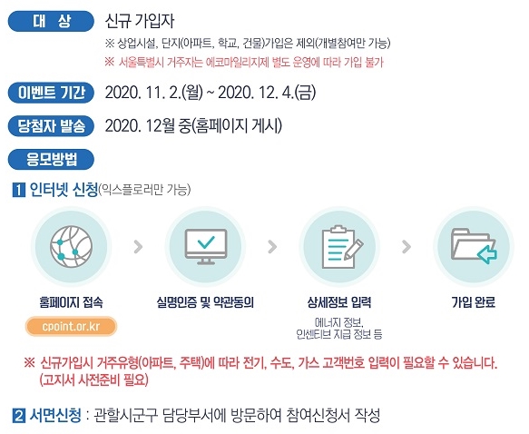 더군다나 지금 2020년에 탄소포인트제 가입하면 신규가입 이벤트에 참여할 수 있습니다. 11월2일에서 12월4일 사이에 가입한 신규가입자 중 신규참여자 규모에 따라 경품이 지급됩니다. 5천명이 가입하면 커피쿠폰 500명, 1만명 달성시 절전멀티탭과 비말차단마스크, 커피쿠폰이, 1만5천명 달성하면 공기청정기, 절전멀티탭, 비말차단마스크, 커피쿠폰에 당첨될 수도 있습니다.